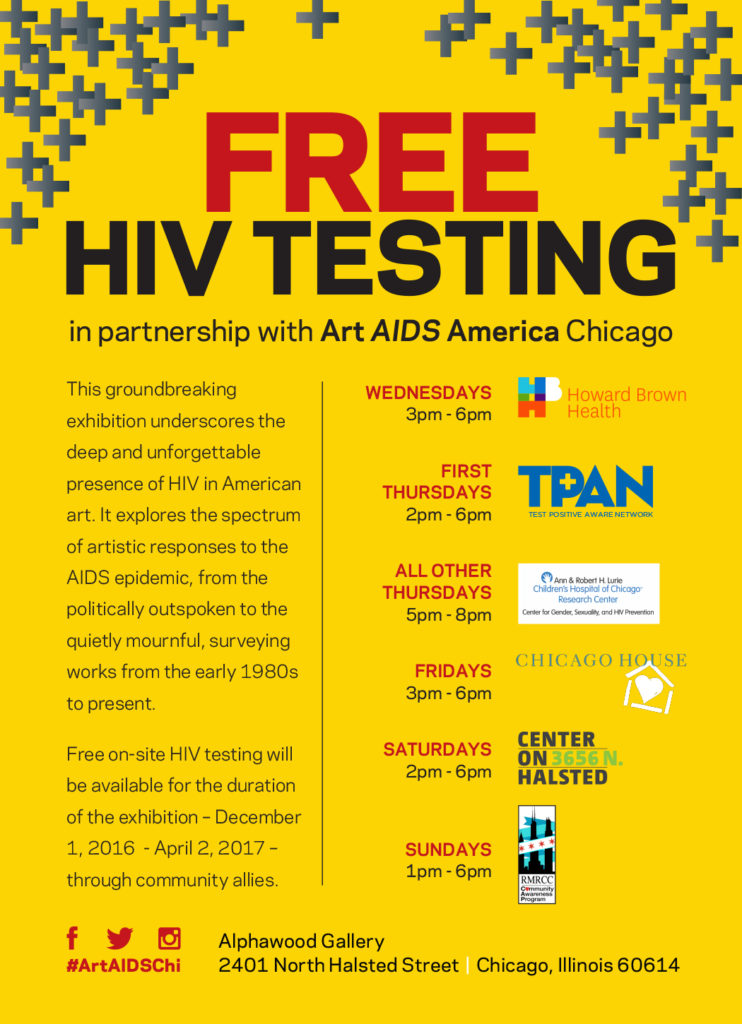 Art AIDS America ran from December 1, 2016 (World AIDS Day) through April 2, 2017, at the Alphawood Gallery in Chicago. We wish to express our deep gratitude to the thousands of people who visited this remarkable exhibition, as well as the many people and institutions that helped make it possible. Please explore our Exhibition website, which is preserved here. Among many other resources, the website contains video documentation of some of the extraordinary programs that took place over the course of the exhibition.
